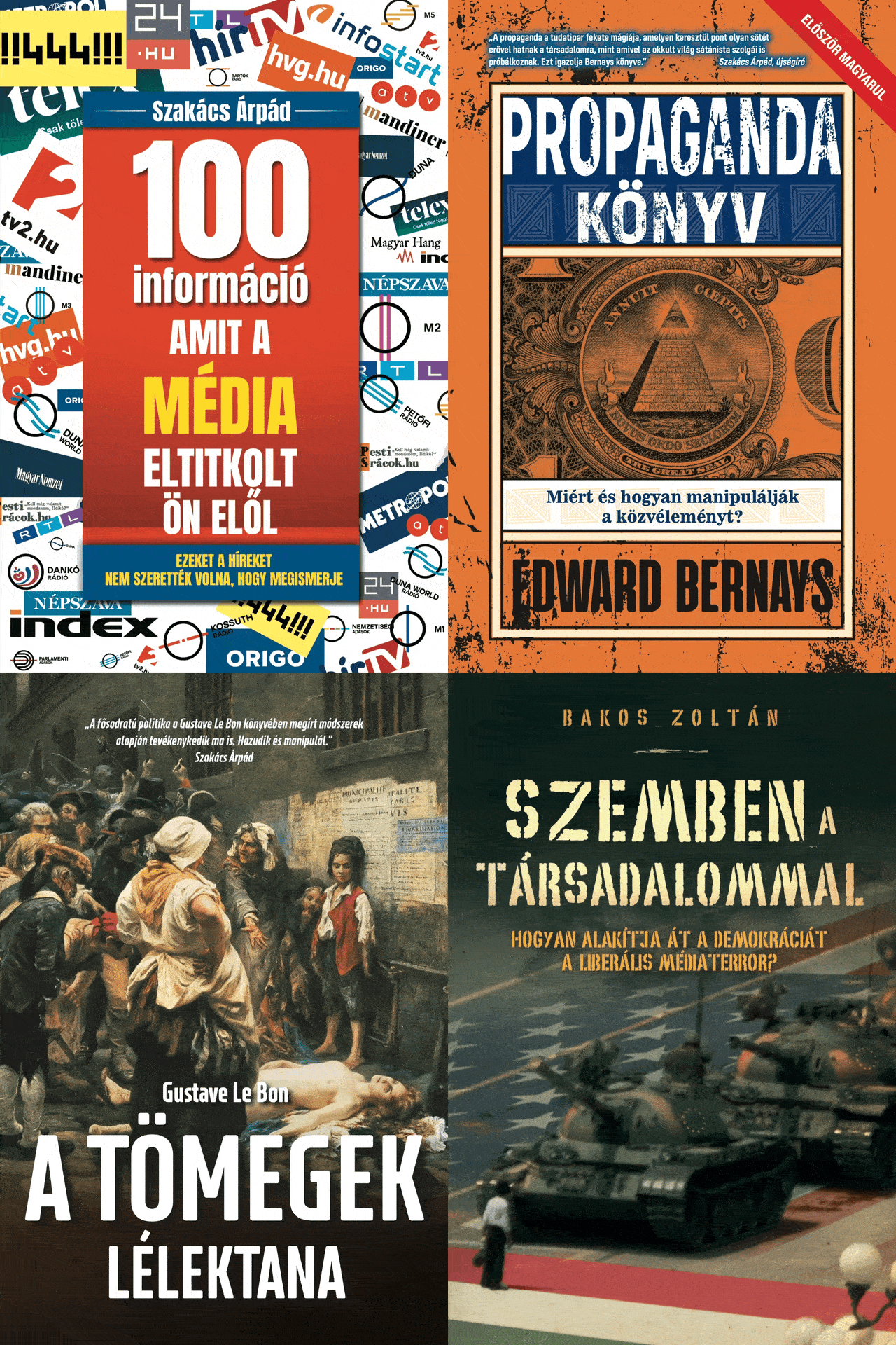 Könyvcsomag-ajánló: Az Antipropaganda könyvcsomag öt alapművet kínál a véleményformálás, tömeglélektan és média manipuláció megértéséhez. Szemléletformáló könyvek a propaganda mechanizmusainak felismeréséhez és a kritikus gondolkodás erősítéséhez.